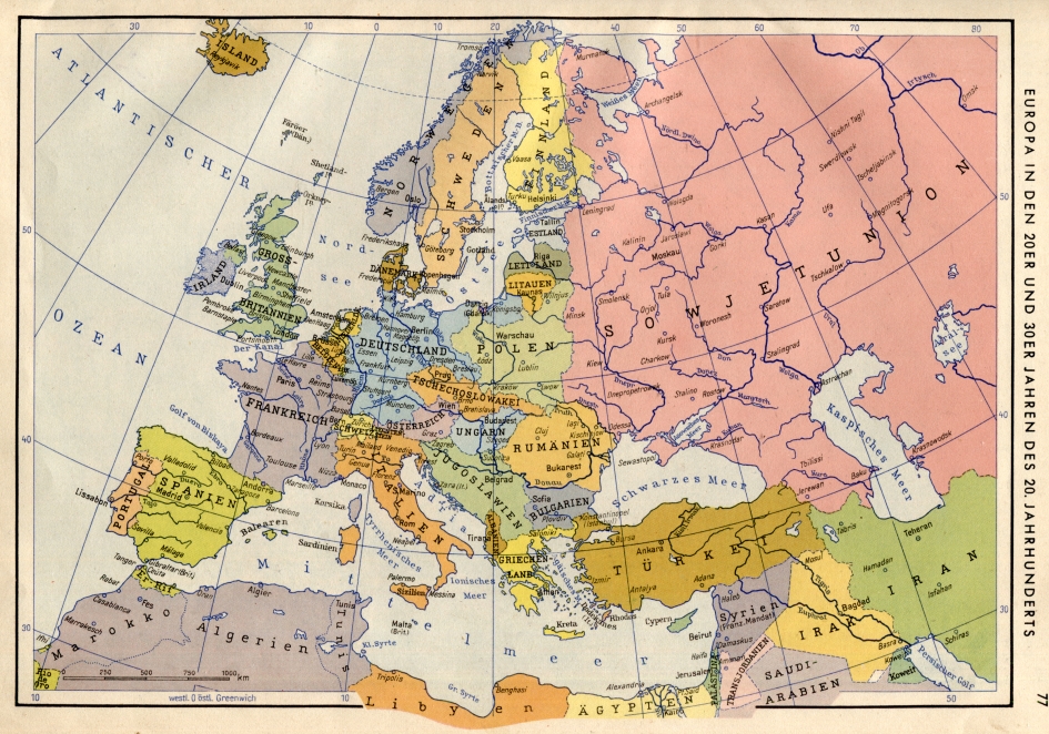 Besonders auffallend: das Bild Deutschlands zum Vergleich (rechts oben) zeigt keine innerdeutschen Grenzen – versteckter Hinweis, unwieweit die DDR selbst noch im Jahre 1954 sich dem Ziel der deutschen Einheit verpflichtet fühlte !!! Im selben Atlas eine Karte zur territorialen Situation der 20er/30er Jahre und darin ablesbar die sowjetischen Westgrenzen ohne große Gebiete der heutigen Ukraine :