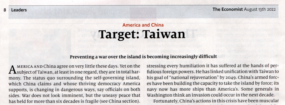 August/September – die Monate, bisher in der modernen Geschichte Europas und Asiens genutzt, größere militärische Aktionen zu beginnen. Nehmen wir uns deshalb etwas Zeit, in einem der meistgelesenen politischen Magazine, dem in London herausgegebenen ECONOMIST, zu blättern – Ausgabe vom 13. – 19. August 2022.