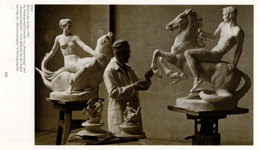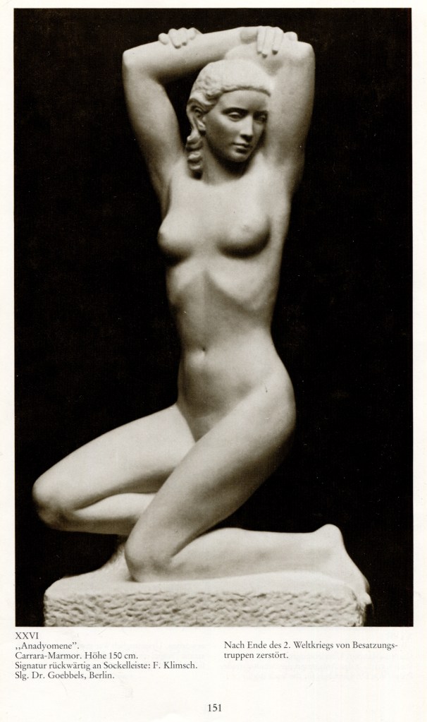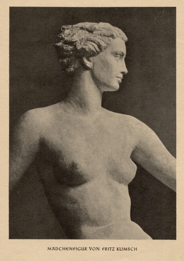 An diesem Ort sei der Hinweis erlaubt, dass in einer kunsthistorischen wissenschaftlichen Arbeit (Heike Hümme, Künstlerischer Opportunismus in der Malerei und Plastik des Dritten Reiches, Dissertation 2004, Technische Universität Carolo-Wilhelomina zu Braunschweig) ein ausführlicher Nachweis der bewußten und aktiven Unterwerfung Fritz Klimschs unter die stilistischen und ästhetischen Anforderungen des NS-Regimes an die Aktgestaltung (weiblich und männlich) geführt wird. Deshalb werde ich aus Platzgründen auf dieses Thema hier nicht eingehen und empfehle Interessenten das Studium dieser Arbeit.