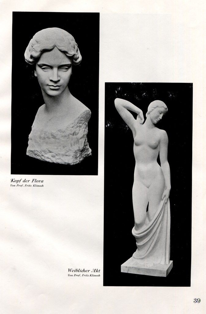 Werner Rittich (1906-1978, in der Nachkriegszeit Redakteur beim „Hamburger Abendblatt“ !) , einer der kulturpolitischen Chefpropagandisten des NS-Regimes, widmete im Kriegsjahr 1940 in der von ihm mitgeleiteten Propagandaschrift der NSDAP „Die Kunst im Deutschen Reich“ acht großformatige Seiten incl. neun Abbildungen in bester Druckqualität auf bestem Papier dem Künstler Fritz Klimsch zum 70. Geburtstag.