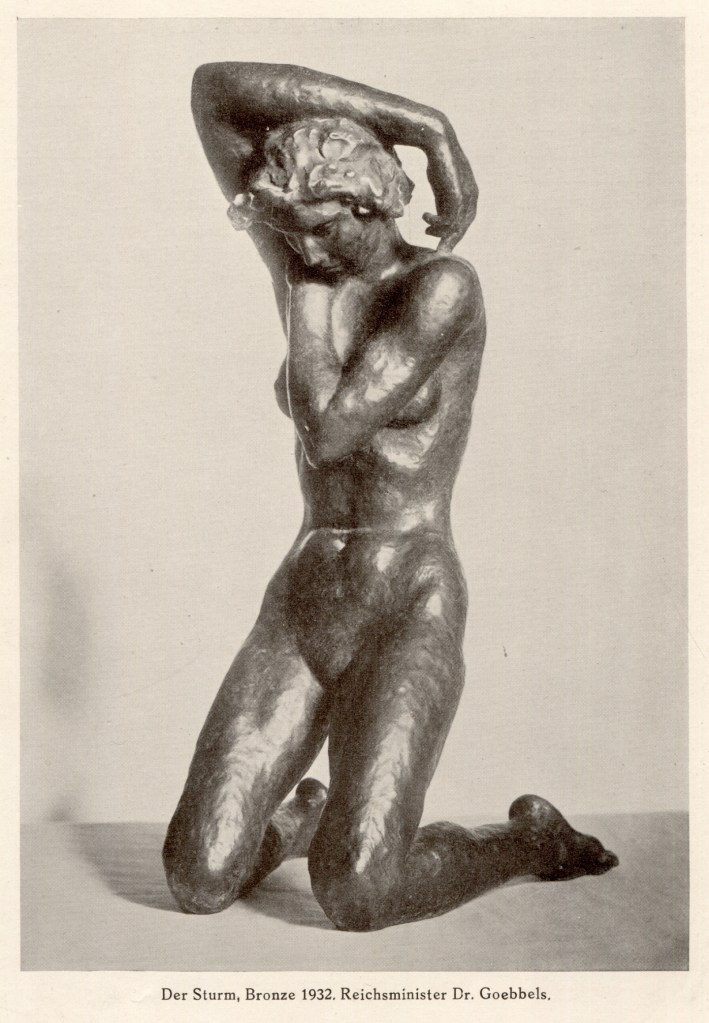 Ein Beispiel für die bundesrepublikanische „Umschreibung“ der Tatsache, dass es sich um eine von Goebbels bestellte Skulptur im Gebäude des Propaganda-Ministeriums handelt -aus einem Ausstellungskatalog von 1980 (Hannover) :