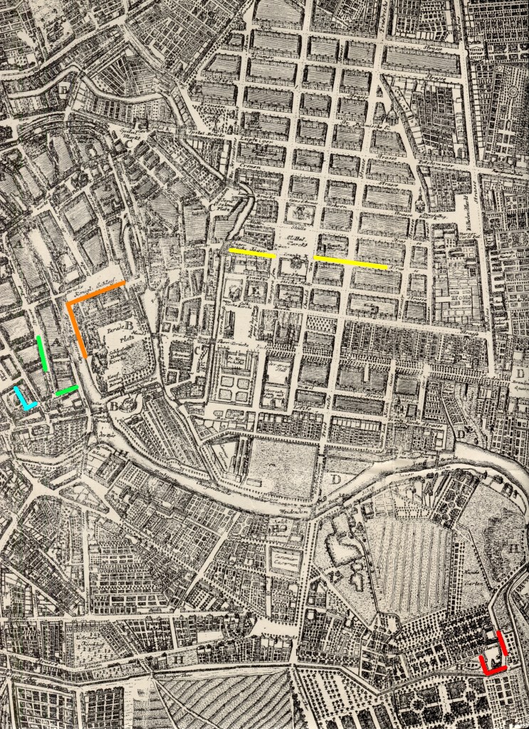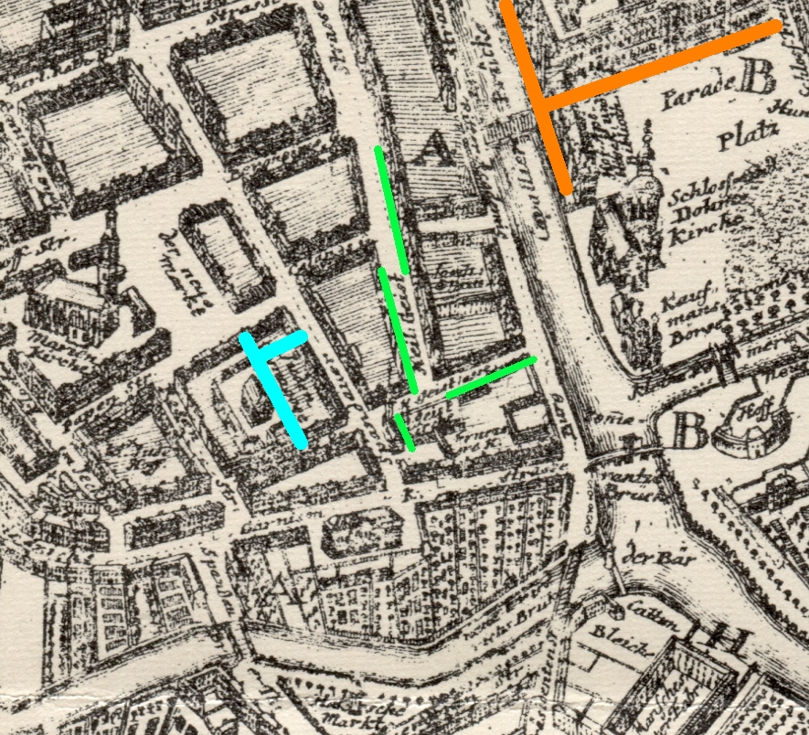 Ich vertiefe mich tagelang in Esthers Brief und beginne erste Fäden zu entdecken – nächtliche Spaziergänge, verstohlene Liebesschwüre in der Wohnung einer Freundin von Esther – auch einen Hinweis auf die benachbarte Garnisonkirche, auf den Kanal mit seinen Maulbeerbäumen an beiden Ufern, – die Garnisonschule – und schließlich Mendel Oppenheims Bank in der Burgstraße an der Ecke zur Neuen Friedrichstraße (auf dem Schleuen-Plan an diesem Abschnitt Garnison-Kirchen-Straße benannt, von mir lila eingefärbt):
