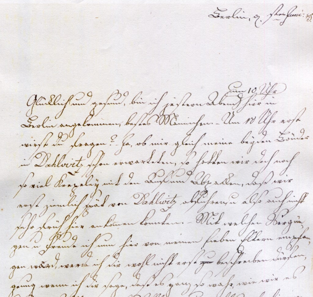 „Glücklich und gesund bin ich gestern Abend um 10 Uhr hier in Berlin angekommen, bestes Männchen. Um 10 Uhr erst, wirst du fragen? Ja, ob mir gleich meine beyden Brüder in Dahlwitz schon erwarteten, so hatten wir doch noch so viel … , daß wir erst ziemlich spät von Dahlwitz abfuhren also auch nicht sehr früh hier ankommen konnten. Mit welchen Umarmungen und Küssen und Freude ich nun hier von meinen lieben Eltern empfangen ward, werde ich dir wohl nicht erst beschreiben dürfen, genug wenn ich dir sage, daß es ganz so wahr, wie wir es uns vorstellten.
