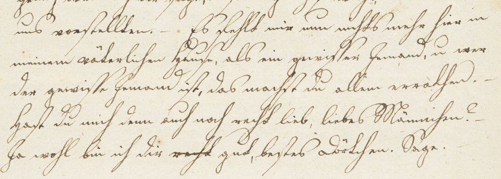 Ich sitze jetzt in Mamans-Stube zu schreiben, Du kannst also wohl denken, daß mehrvom Plaudern als vom Schreiben wird, ich muß daher für heute … schließen, und Dir ein andermal, wenn ich oben … allein sitze werde … Ich küsse Dich in Gedanken so viel daß mir der Mund gewiß …