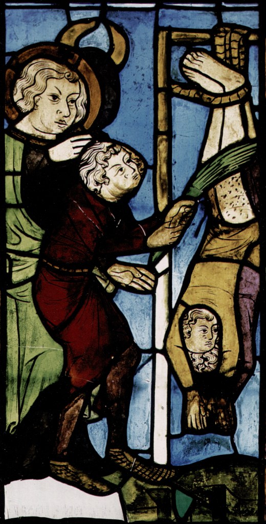 Gestern nun fand ich eine Szene im rechten Fenster, die über das hinausging, was den Studiosus so sehr ergriffen hatte: ein Mann, der kopfüber an den Beinen aufgehängt ist, wird von einem Jüngling, der durch ein freundliches Gesicht, fast kindlich noch, characterisirt ist, mit einem Rutenbündel gnadenlos ausgepeitscht.