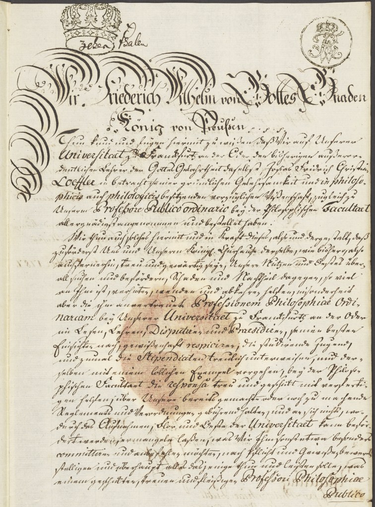 In den versiegelten Umschlägen lagen jeweils ebenfalls versiegelte Schreiben – beide aus Frankfurt, einer vom Professor Wünsch und der andere vom Pfarrer Carl Samuel Protzen, seinem Nachfolger im Amt an der Marienkirche.